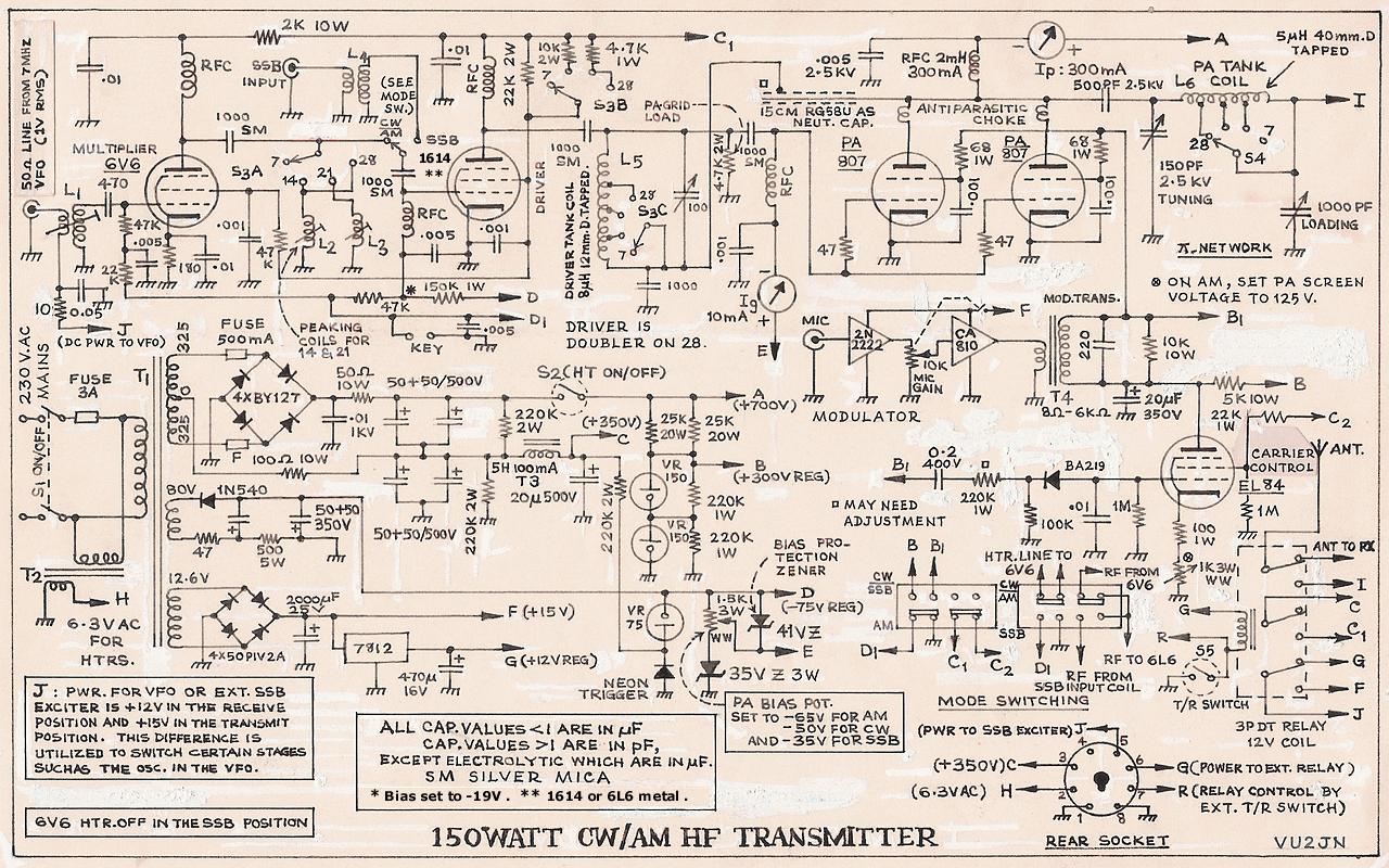 This 150W HF Amateur Bands Transmitter/Amplifier was designed by Prof. Jayaraman VU2JN for the club around 1983. A solidstate FET - VFO (Variable Frequency Oscillator) and a multiplier tube tranmitter with 807 final tubes. Operates on AM (Solidstate modulator with TBA810 AF power amplifier) and CW, with provision to use the transmitter as an SSB linear amplifier. May be more details and story later ...