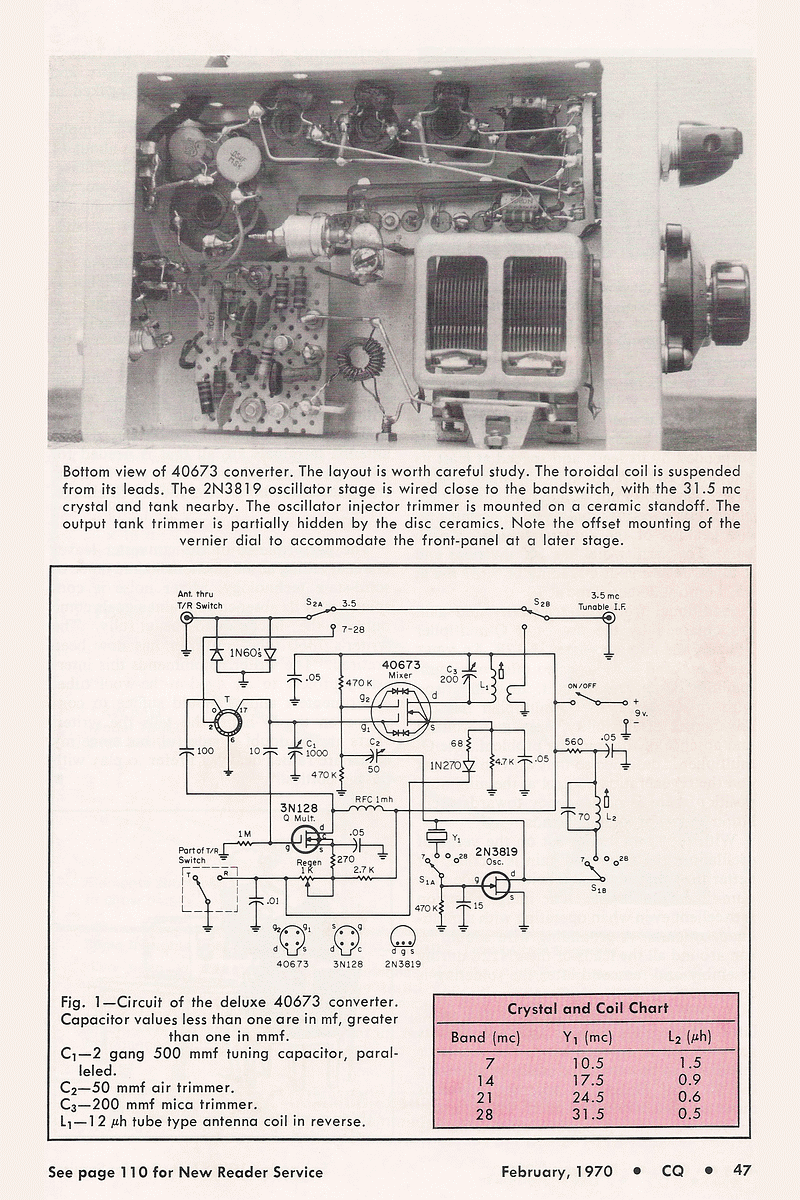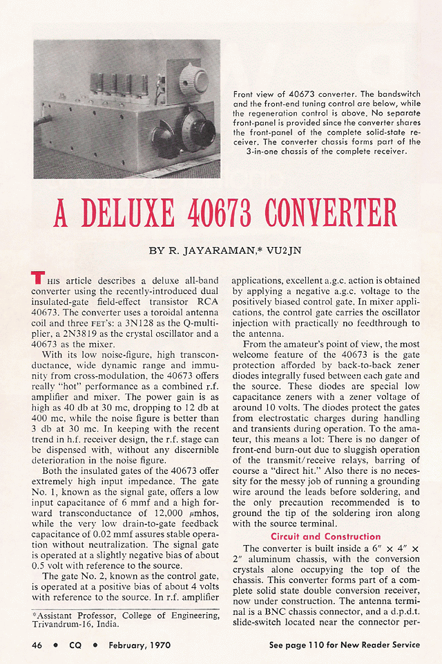 There is an interesting background to the construction of my 40673 Converter. RCA released 40673 in Aug. 1969. A U.S. ham, who owned a small electronics firm and who had earlier read the QST article on my 500 mW Transistor Transmitter, sent me 2 Nos. of 40673 (along with the data sheets) which he had received from RCA as "Experimenter's Sample" in Sept. 1969. In Oct. 1969, I started building the converter and finished it in Nov. Surprised by the good performance of the converter, I sent an article on it to CQ magazine. They acted quickly to publish my article in the Feb. 1970 issue of CQ. Quite a few U.S. hams expressed their appreciation for my article. - VU2JN