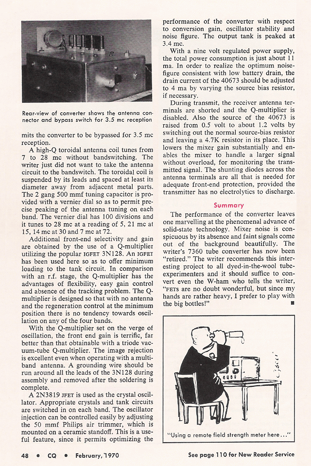 This article on the Dual-gate FET Converter appeared in the February 1970 issue of CQ magazine. Probably, that was the first article by a ham on a converter using dual-gate FETs.