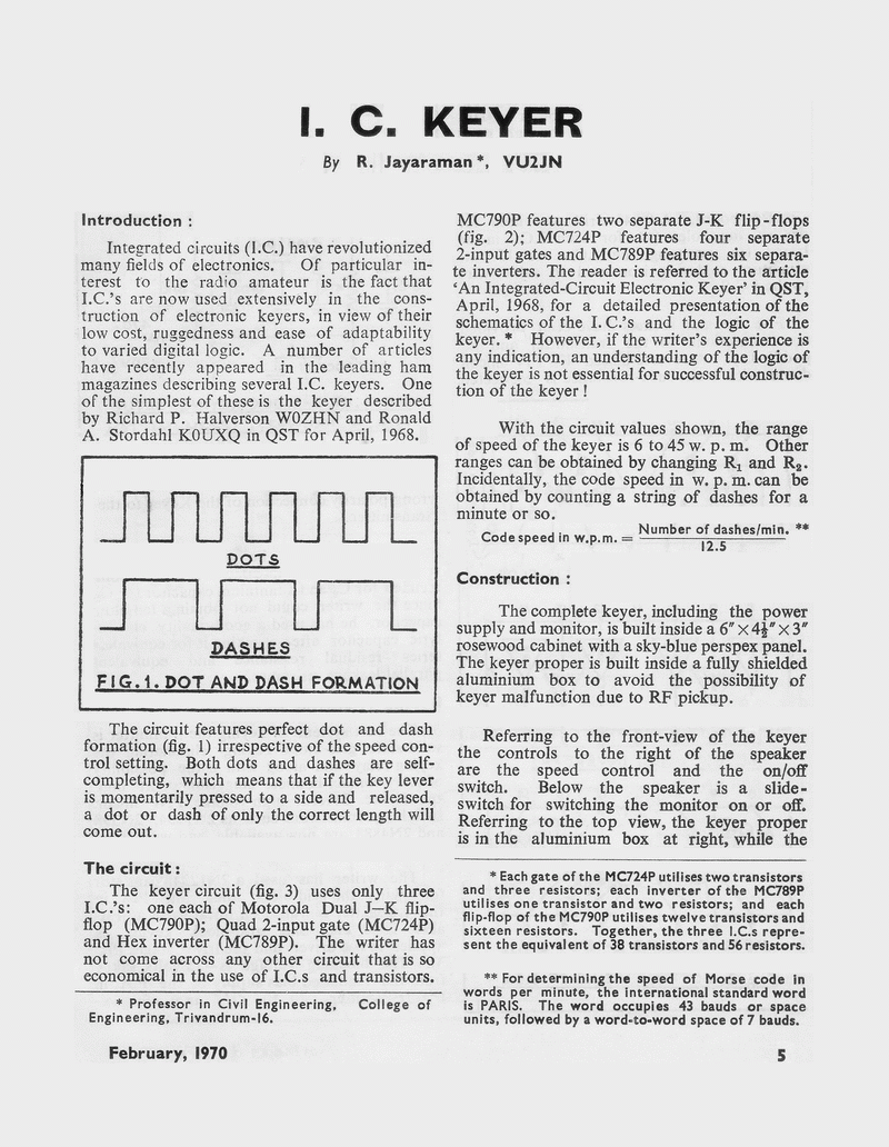 The month of Feb. 1970 turned out to be memorable for me because of the publication of two of my better-appreciated ham-radio articles. The keyer described in the above article was the first I.C. keyer to be built by a VU ham. - VU2JN
